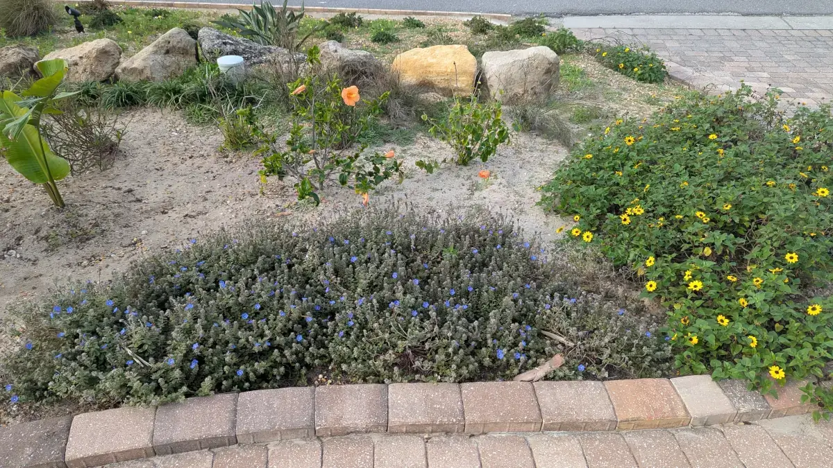 Weed the north end of the front yard south bed driveway to boulder wall. Smooth the surface.