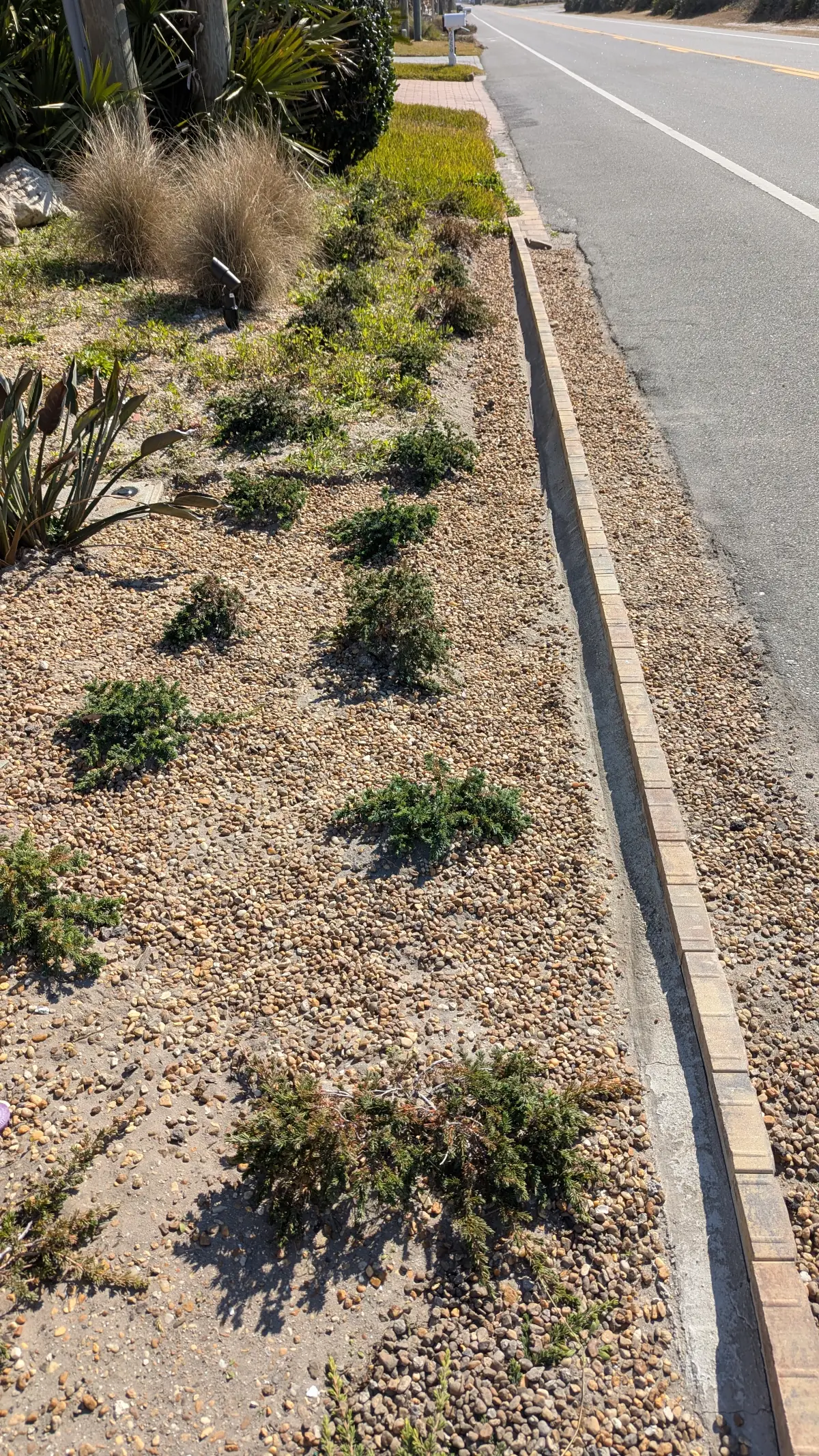 Front yard south bed roadside: Pull large weeds with roots. Shovel dirt and pebbles in gutter and between landscape plants. Sift dirt and weeds from pebbles into plastic bin. Spread and smooth the pebbles. Transfer dirt to beach at bulkhead.