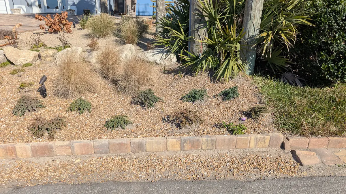 Front yard south bed roadside: Shovel 2″ of dirt and pebbles between landscape plants. Sift dirt from pebbles into plastic bin using vibration motor. Spread and smooth the pebbles.
