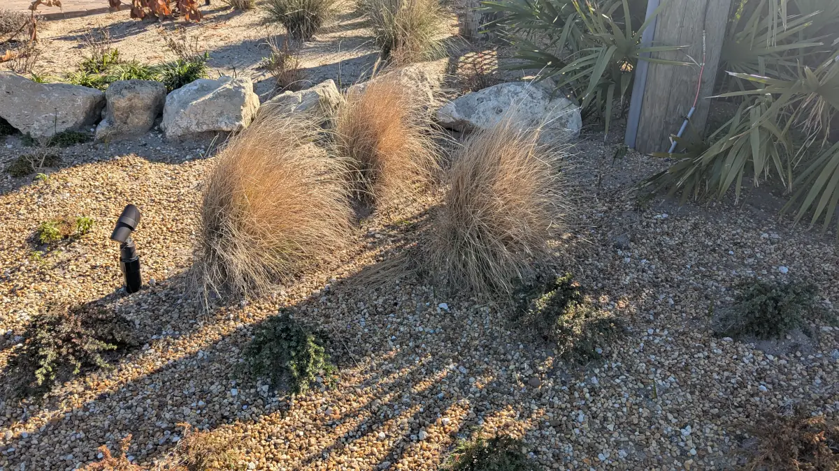 Front yard south bed roadside: prune (3) fountain grass. Remove dead tillers.