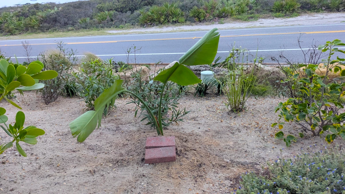 Replace dead bird of paradise with similar live palm from Amy; support with bricks for high wind. Extract camphorweed from southwest dune sunflowers. Trim camphorweed back to base for a colorful shrub. 5:20-6:55